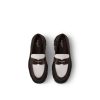 The LV Record loafer is revisited this season in two-tone glazed calf leather. This model is notable for its chunky, ornately decorated outsole in lightweight EVA rubber, which features LV Circle and Monogram Flower charms on a nautical chain. The Louis Vuitton signature is embossed on the strap.
