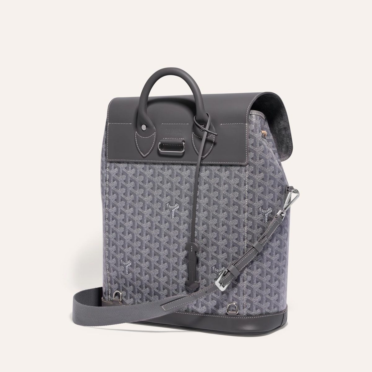 Jewelry: Palladium Drawstring and roller buckle fastening system 15-inch padded inside pocket, half-circle stud for keys inside front zip pocket containing: card pocket, multi-use pocket, pen pocket, zip access to the main compartment, leather gendarme key Height of the handle(s) : 7 cm Goyardine Canvas & Clamecy Cowhide Linen and Cotton Inner Side Length: 32 cm Width: 15.5 cm Height: 39 cm Weight: 1.325 kg The Alpin backpack is a clever model designed to be worn in different ways with its adjustable strap and leather secured key. It is very functional with several interior and exterior pockets and is still light.