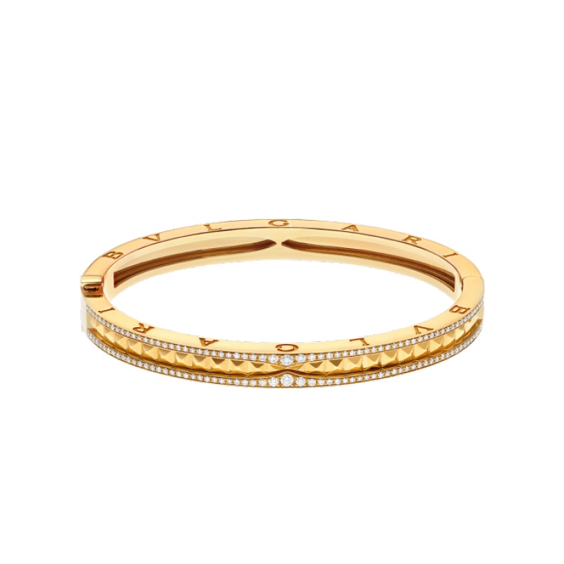 The B.zero1 Rock collection draws inspiration from the world-famous amphitheater, the Colosseum, and embodies the creative vision and uninhibited style of Bvlgari. The unique spiral design is reinterpreted with gold studs, challenging the essence of jewelry aesthetics and highlighting the freedom and forward-looking spirit of Bvlgari’s classic design. B.zero1 Rock series 18K yellow gold bracelet, decorated with pavé diamonds