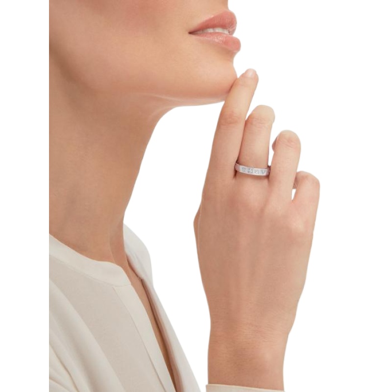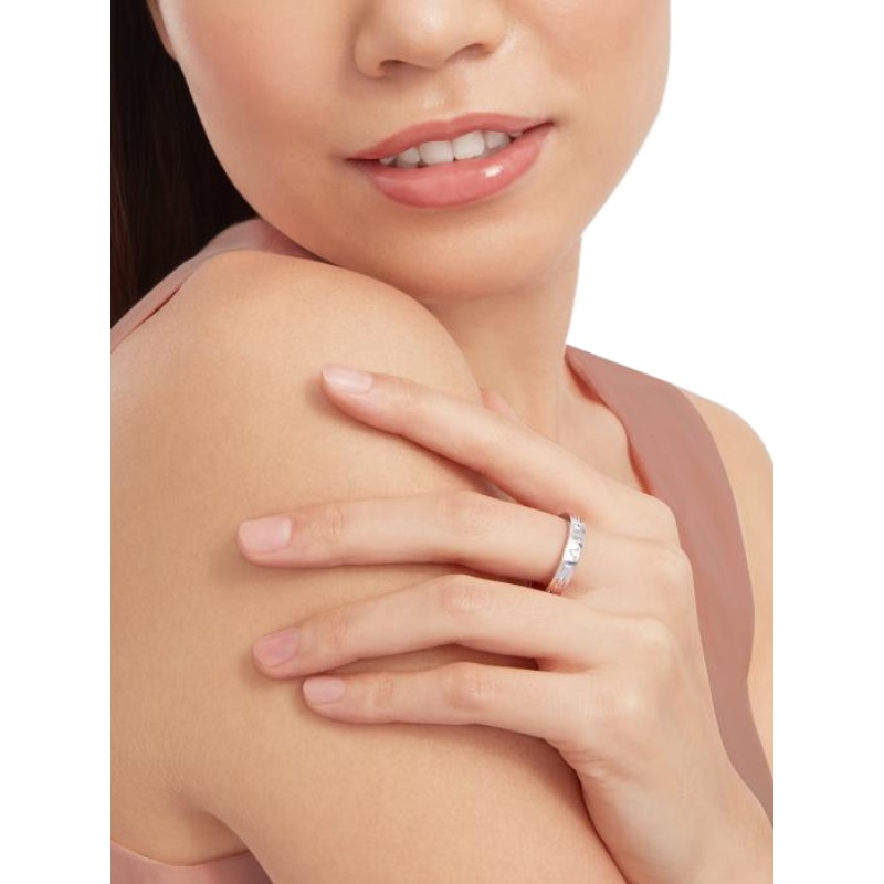 The B.zero1 Essential ring in 18K white gold and set with a single diamond is a modern interpretation of elegance rooted in Bvlgari’s Roman heritage. This ring is a reflection of the collection’s aesthetic, reinterpreting the prestigious Maison’s logo as a unique and timeless design element. This versatile piece can be easily layered to create a variety of modern and timeless looks, and it is a clever way to express your personality.