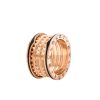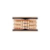 The B.zero1 Rock collection draws inspiration from the world-famous amphitheater, the Colosseum, and reflects Bvlgari’s creative vision and uninhibited style. The unique spiral design is reinterpreted with gold studs, challenging the essence of jewelry aesthetics and highlighting the freedom and forward-looking spirit of Bvlgari’s classic design. B.zero1 Rock collection 18K rose gold four-band ring inlaid with black ceramic.