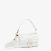 Iconic medium Baguette bag embroidered all-over with white metallic sequins in different shapes and sizes. Decorated with an FF clasp.