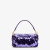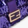 Iconic medium Baguette bag finely embroidered all-over with purple sequins of different shapes and sizes to create a 3D effect and decorated with an FF clasp. This style is a re-release of the original version first introduced in the Autumn/Winter 1999-2000 Collection. Features a front flap, tone on tone leather details and magnetic clasp. Internal compartment with zip pocket and gold-finish metalware. The bag can be carried by hand, or worn either on the shoulder or cross-body thanks to the leather handle and shoulder strap, both detachable. Made in Italy