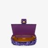 Iconic medium Baguette bag finely embroidered all-over with purple sequins of different shapes and sizes to create a 3D effect and decorated with an FF clasp. This style is a re-release of the original version first introduced in the Autumn/Winter 1999-2000 Collection. Features a front flap, tone on tone leather details and magnetic clasp. Internal compartment with zip pocket and gold-finish metalware. The bag can be carried by hand, or worn either on the shoulder or cross-body thanks to the leather handle and shoulder strap, both detachable.