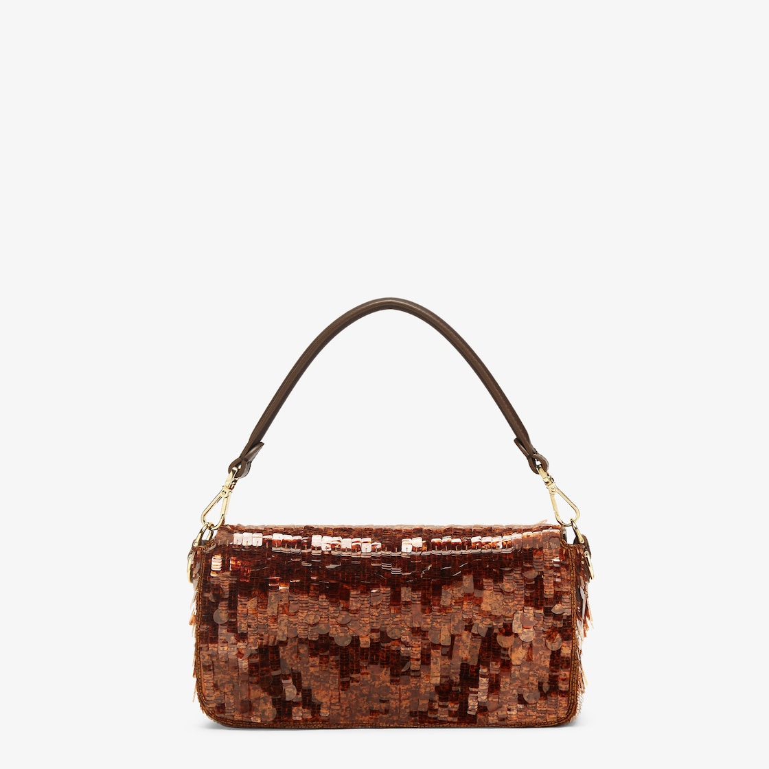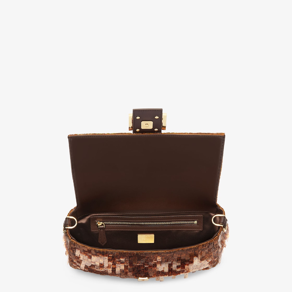 Iconic medium Baguette bag, created in 1997 which went on to become the leading It bag. Versatile and with timeless appeal, it features the iconic underarm design inspired by the French Baguette bread from which it takes its name. Hand-embroidered with brown tortoiseshell-effect sequins of different shapes and sizes. Trimmed in brown calfskin and embellished with an FF clasp with tortoiseshell plexiglass filling. Featuring a front flap, magnetic clasp, brown satin-lined internal compartment with a zipper pocket and gold-finish metalware. The bag can be carried by hand, or worn either on the shoulder or cross-body thanks to the handle and shoulder strap, both detachable. Made in Italy