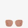 Oversized square Baguette sunglasses in golden metal with FF Baguette logo on the temples. Brown lenses with gold-mirrored FF logo and adjustable nose pads.