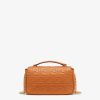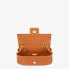 Iconic medium Baguette bag with chain made of brown soft nappa leather with a three-dimensional texture FF motif. Decorated with an FF clasp. Featuring a front flap, magnetic clasp, lined internal compartment with zip pocket and vintage gold-finish metalware. Can be carried by hand or over the shoulder thanks to the sliding-chain shoulder strap. Made in Italy