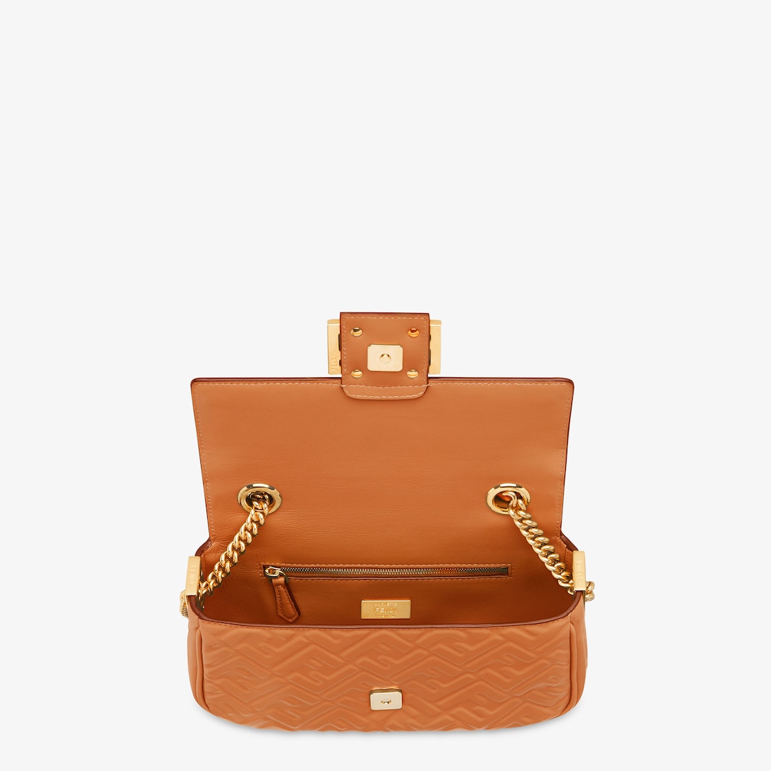 Iconic medium Baguette bag with chain made of brown soft nappa leather with a three-dimensional texture FF motif. Decorated with an FF clasp. Featuring a front flap, magnetic clasp, lined internal compartment with zip pocket and vintage gold-finish metalware. Can be carried by hand or over the shoulder thanks to the sliding-chain shoulder strap. Made in Italy