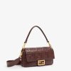 Iconic medium Baguette bag, part of the collection curated with designer Stefano Pilati, made of burgundy soft nappa leather with a three-dimensional texture embossed FF motif. Decorated with an FF clasp. Featuring a front flap, magnetic clasp, internal compartment with zip pocket and vintage gold-finish metalware. The bag can be carried by hand, or worn either on the shoulder or cross-body thanks to the handle and shoulder strap, both detachable. Made in Italy