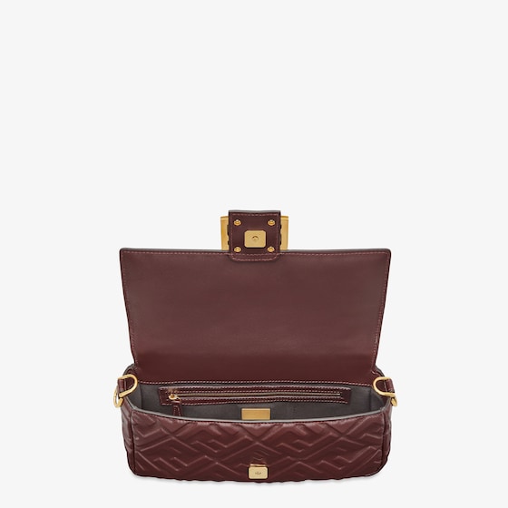 Iconic medium Baguette bag, part of the collection curated with designer Stefano Pilati, made of burgundy soft nappa leather with a three-dimensional texture embossed FF motif. Decorated with an FF clasp.