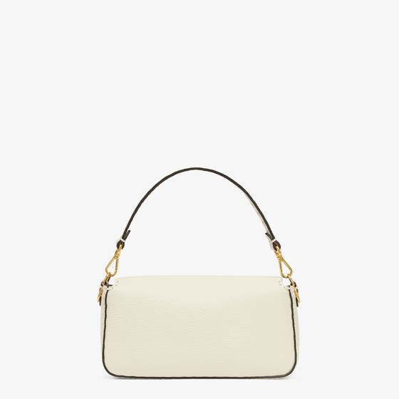 Iconic medium Baguette bag, made of camellia Cuoio Romano leather embellished by hand with matching-tone stitching. Decorated with an FF clasp.