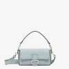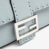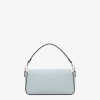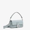 Medium, iconic Baguette bag made with 612 tone-on-tone macro topstitches, an emblem of the iconic Selleria workmanship handed down through generations of Fendi artisans since 1925. Made of light blue Cuoio Romano leather, calfskin with a characteristic natural grain produced with a metal-free tanning process. Featuring a front flap, magnetic clasp, one internal compartment lined in calfskin and an internal zip pocket. Selleria logo plate in silver, palladium-finish metalware. Decorated with an FF clasp. The bag can be carried by hand, or worn either on the shoulder or cross-body thanks to the handle and shoulder strap, both detachable. Made in Italy