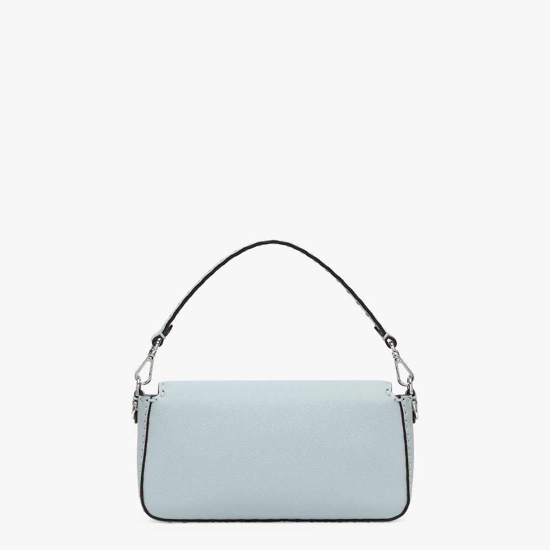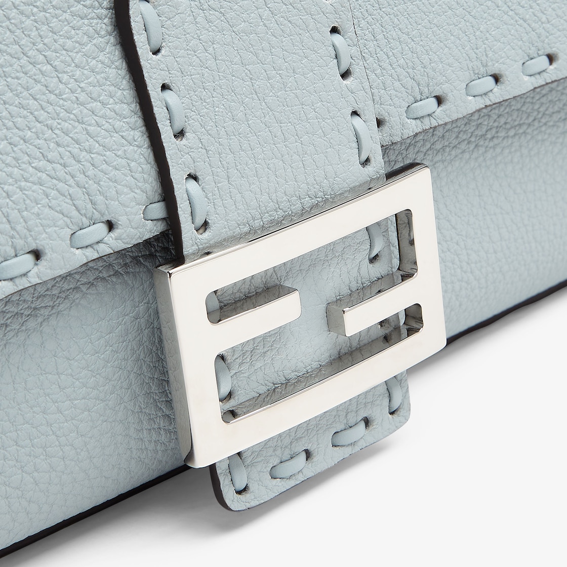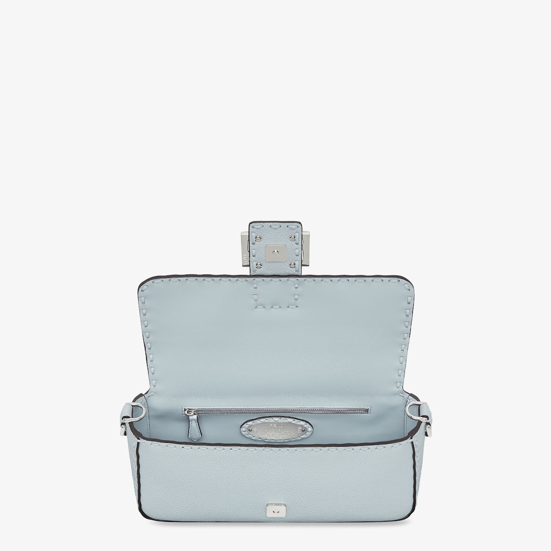 Medium, iconic Baguette bag made with 612 tone-on-tone macro topstitches, an emblem of the iconic Selleria workmanship handed down through generations of Fendi artisans since 1925. Made of light blue Cuoio Romano leather, calfskin with a characteristic natural grain produced with a metal-free tanning process. Featuring a front flap, magnetic clasp, one internal compartment lined in calfskin and an internal zip pocket. Selleria logo plate in silver, palladium-finish metalware. Decorated with an FF clasp. The bag can be carried by hand, or worn either on the shoulder or cross-body thanks to the handle and shoulder strap, both detachable. Made in Italy