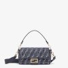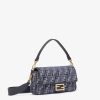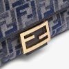 Iconic medium Baguette bag, created in 1997 which went on to become the leading It bag. Versatile and with timeless appeal, it features the iconic underarm design inspired by the French Baguette bread from which it takes its name. Made of chenille with the iconic FF motif in dark blue gradient tones, embellished with dark blue calfskin trim and decorated with an FF clasp. Featuring a front flap, magnetic clasp, internal compartment lined in gray fabric with a zipper pocket and gold-finish metalware. The bag can be carried by hand, or worn either on the shoulder or cross-body thanks to the calfskin handle and shoulder strap, both detachable. Made in Italy