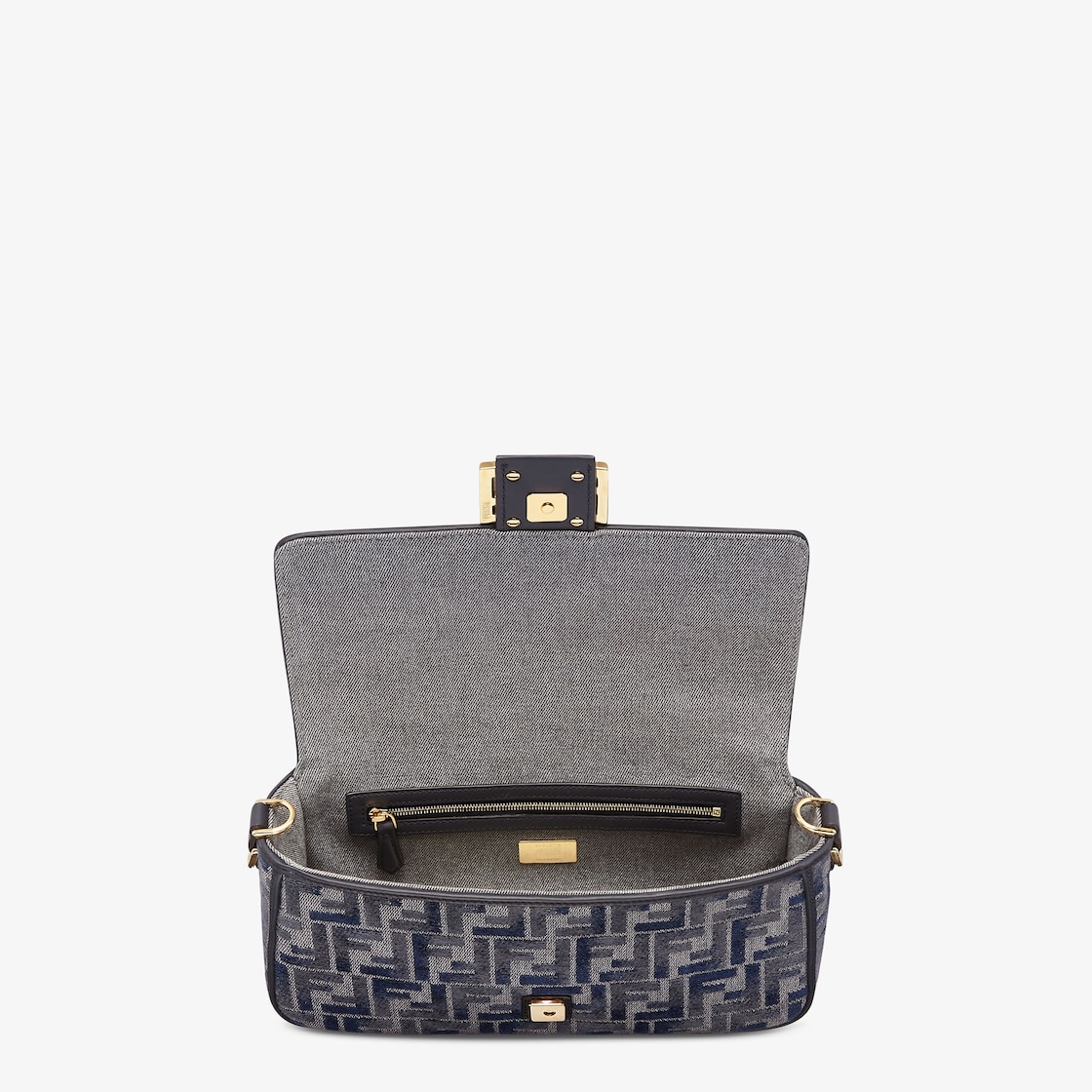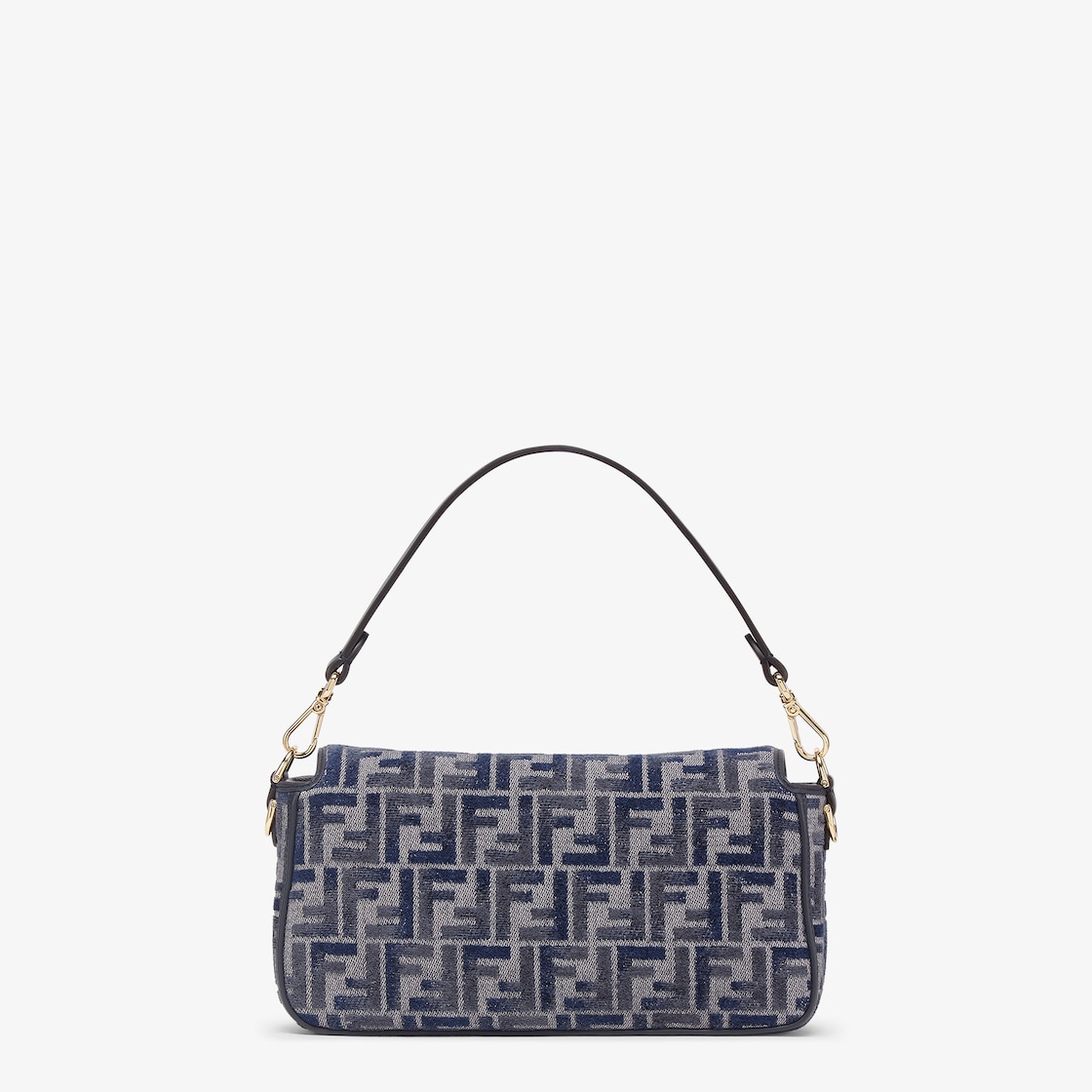 Iconic medium Baguette bag, created in 1997 which went on to become the leading It bag. Versatile and with timeless appeal, it features the iconic underarm design inspired by the French Baguette bread from which it takes its name. Made of chenille with the iconic FF motif in dark blue gradient tones, embellished with dark blue calfskin trim and decorated with an FF clasp. Featuring a front flap, magnetic clasp, internal compartment lined in gray fabric with a zipper pocket and gold-finish metalware. The bag can be carried by hand, or worn either on the shoulder or cross-body thanks to the calfskin handle and shoulder strap, both detachable. Made in Italy