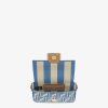 Iconic small Baguette bag made of jacquard fabric with the iconic FF motif in shades of light bue, embellished with light blue embroidered borders, beige leather details and embellished with an FF clasp. Featuring a front flap, magnetic clasp, one internal compartment lined jacquard fabric with light blue Pequin stripes and with a pocket and gold-finish metalware. The bag can be carried by hand, or worn either on the shoulder or cross-body thanks to the handle and chain shoulder strap, both detachable. Made in Italy