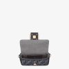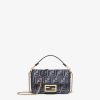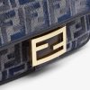 Small iconic Baguette bag made of chenille with the iconic FF motif in dark blue gradient tones, embellished with dark blue calfskin trim and decorated with an FF clasp. Featuring a front flap, magnetic clasp, one gray fabric-lined internal compartment with a calfskin pocket and gold-finish metalware. The bag can be carried by hand, or worn either on the shoulder or cross-body thanks to the calfskin handle and chain shoulder strap, both detachable. Holds a 6.7-inch smartphone, Mini Trifold card holder or wallet, keys and lipstick. Made in Italy