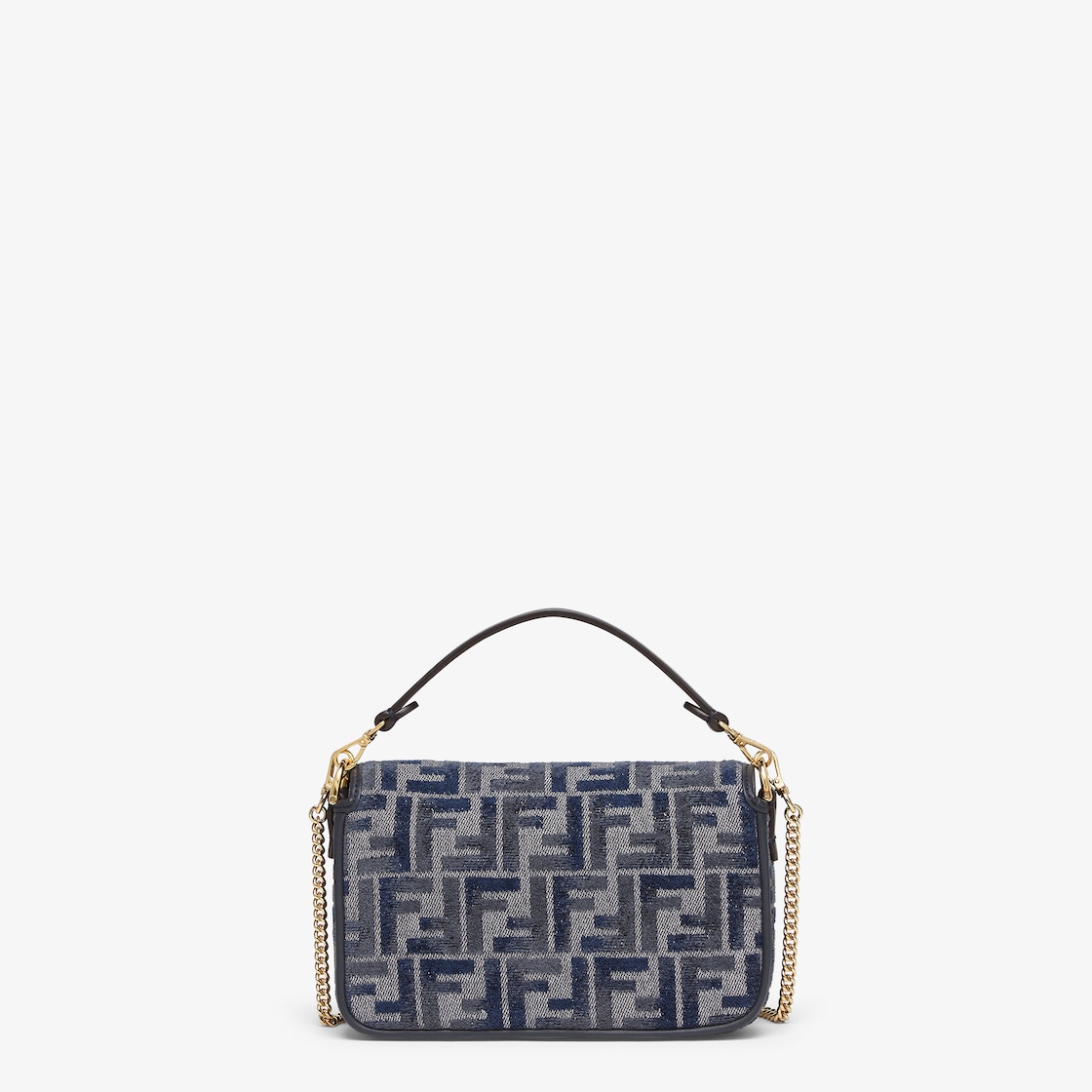 Small iconic Baguette bag made of chenille with the iconic FF motif in dark blue gradient tones, embellished with dark blue calfskin trim and decorated with an FF clasp. Featuring a front flap, magnetic clasp, one gray fabric-lined internal compartment with a calfskin pocket and gold-finish metalware. The bag can be carried by hand, or worn either on the shoulder or cross-body thanks to the calfskin handle and chain shoulder strap, both detachable. Holds a 6.7-inch smartphone, Mini Trifold card holder or wallet, keys and lipstick. Made in Italy