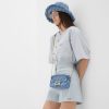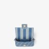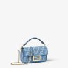 Iconic small Baguette bag made of denim-effect FF jacquard in shades of blue. Embellished with FF clasp and tone-on-tone leather details. Features a front flap, magnetic clasp, fabric-lined internal compartment with a pocket and gold-finish metalware. The bag can be carried by hand or worn either on the shoulder or cross-body thanks to the handle and chain shoulder strap, both detachable. Holds a 6.7-inch smartphone, Mini Trifold card holder or wallet, keys and lipstick. Measurements: