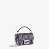 Iconic mini Baguette bag with all-over embroidery in metallic sequins of different shapes and sizes that create a gradient effect in shades of blue. Decorated with an FF clasp. Features a front flap, leather details, tone on tone bead embroidery and magnetic clasp. One internal compartment lined in midnight blue silk with a pocket and palladium-finish metalware. The bag can be carried by hand, or worn either on the shoulder or cross-body thanks to the handle and chain shoulder strap, both detachable. Made in Italy