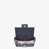 Features a front flap, leather details, tone on tone bead embroidery and magnetic clasp. One internal compartment lined in midnight blue silk with a pocket and palladium-finish metalware.