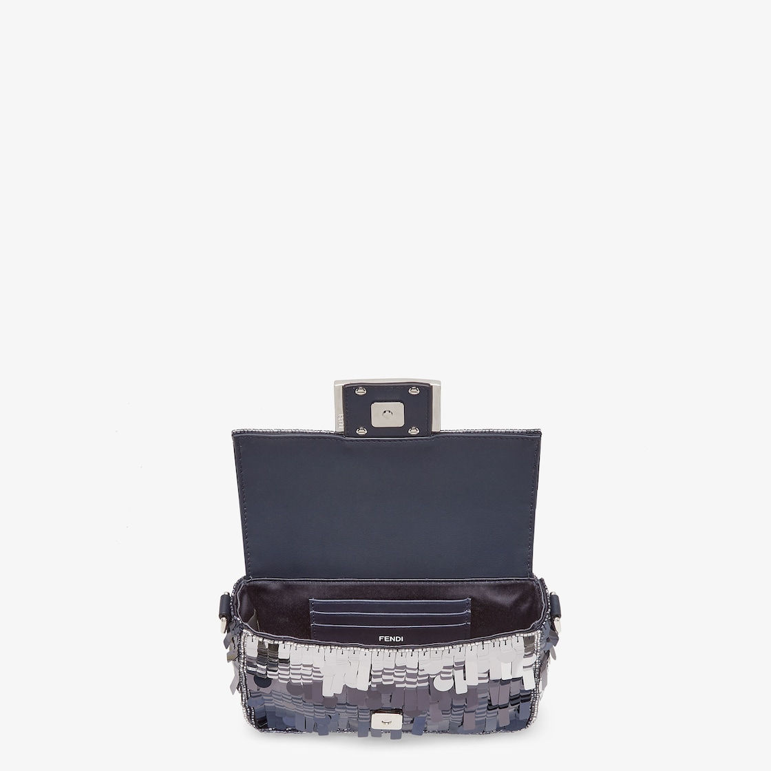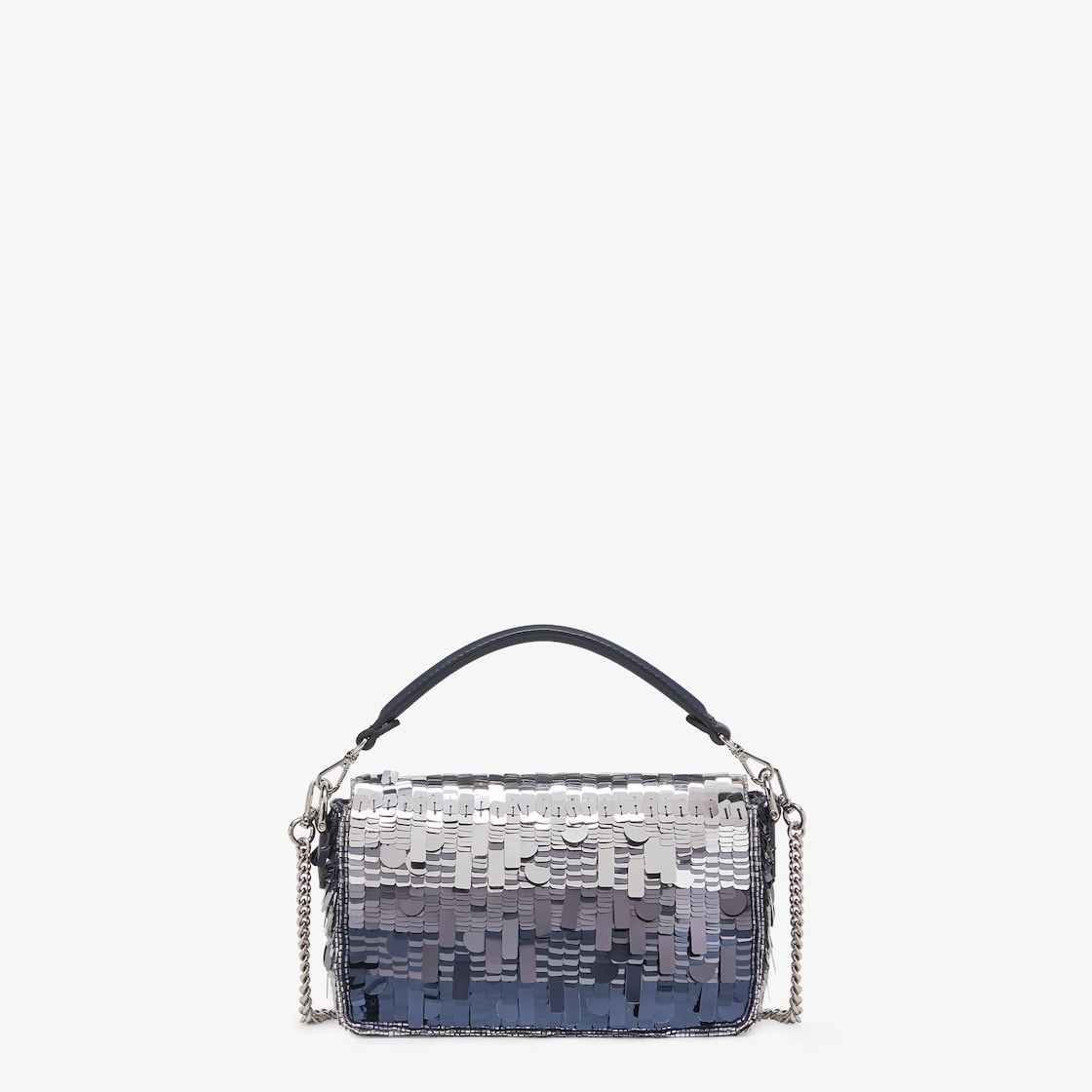 Iconic mini Baguette bag with all-over embroidery in metallic sequins of different shapes and sizes that create a gradient effect in shades of blue. Decorated with an FF clasp. Features a front flap, leather details, tone on tone bead embroidery and magnetic clasp. One internal compartment lined in midnight blue silk with a pocket and palladium-finish metalware. The bag can be carried by hand, or worn either on the shoulder or cross-body thanks to the handle and chain shoulder strap, both detachable. Made in Italy