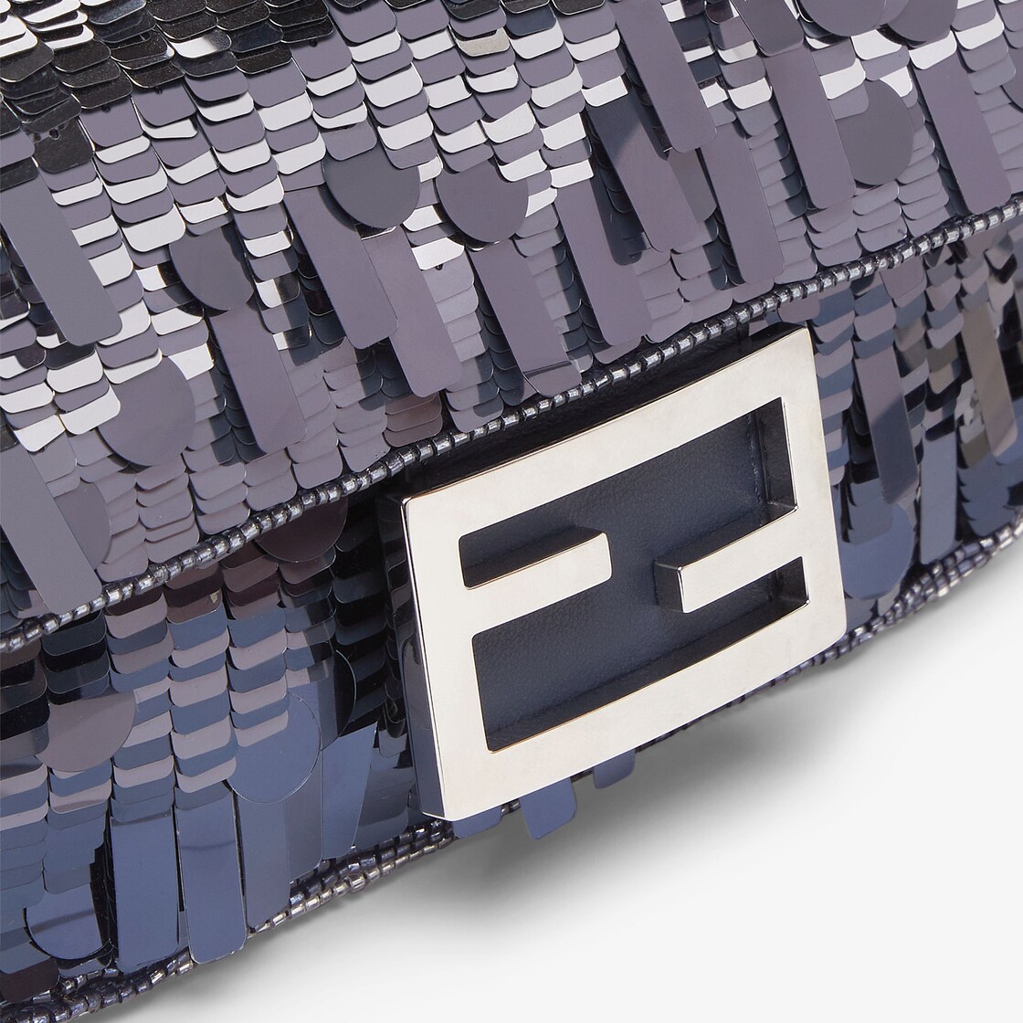 Iconic mini Baguette bag with all-over embroidery in metallic sequins of different shapes and sizes that create a gradient effect in shades of blue. Decorated with an FF clasp.
