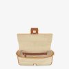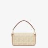 Iconic medium Baguette bag made of natural-coloured straw with a tone-on-tone raised embroidery FF motif. Embellished with a brown leather trim and FF clasp. Featuring a front flap, magnetic clasp, internal compartment with zip pocket and vintage gold-finish metalware. The bag can be carried by hand, or worn either on the shoulder or cross-body thanks to the leather handle and shoulder strap, both detachable.