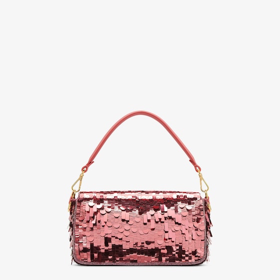Iconic medium Baguette bag, created in 1997 which went on to become the leading It bag. Versatile and with timeless appeal, it features the iconic underarm design inspired by the French Baguette bread from which it takes its name. Hand-embroidered with pink sequins of different shapes and sizes. Trimmed with pink calfskin and embellished with an enameled FF clasp enhanced with glitter. Featuring a front flap, magnetic clasp, satin-lined internal compartment with a zip pocket and gold-finish metalware. The bag can be carried by hand, or worn either on the shoulder or cross-body thanks to the handle and shoulder strap, both detachable. Made in Italy