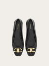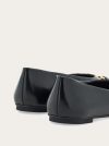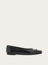 This contemporary ballet flat features a super soft patent leather upper with ruffles at the pointed tip and a new version of the Gancini buckle in golden metal for a chic look. Rubber flexible sole.