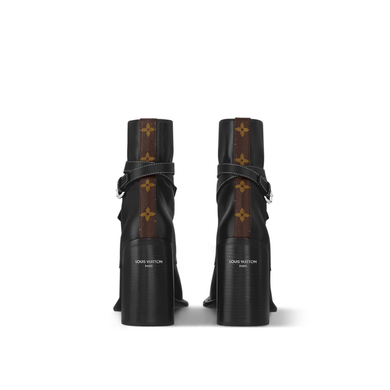 The Berlin ankle boot was a highlight of Nicolas Ghesquière’s 10th anniversary show for Louis Vuitton. This version comes in smooth calf leather embellished with a signature knot detail and silver-toned buckle. Other key details are the trim in Monogram canvas at the back and the Louis Vuitton signature hot-stamped on the high block heel.