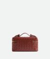 • Intrecciato leather vanity case with detachable strap • One main compartment, one flat pocket • Zippered closure • Material: Calfskin • Lining: Calfskin • Color: Sapele • Hardware: Gold finish • Height: 13cm • Width: 23cm • Depth: 6cm • Handle drop: 4.5 cm | 1.8” • Strap drop: 45 cm | 17.7”