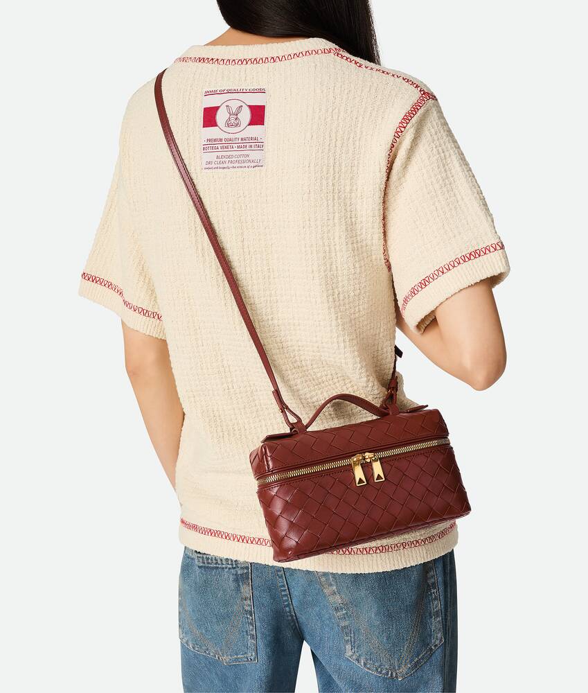• Intrecciato leather vanity case with detachable strap • One main compartment, one flat pocket • Zippered closure • Material: Calfskin • Lining: Calfskin • Color: Sapele • Hardware: Gold finish • Height: 13cm • Width: 23cm • Depth: 6cm • Handle drop: 4.5 cm | 1.8” • Strap drop: 45 cm | 17.7”