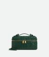 • Intrecciato leather vanity case with detachable strap • One main compartment, one flat pocket • Zippered closure • Material: Calfskin • Lining: Calfskin • Color: Emerald Green • Hardware: Gold finish • Height: 13 cm | 5.1” • Width: 23 cm | 9” • Depth: 6 cm | 2.4” • Handle drop: 4.5 cm | 1.8” • Strap drop: 45 cm | 17.7”