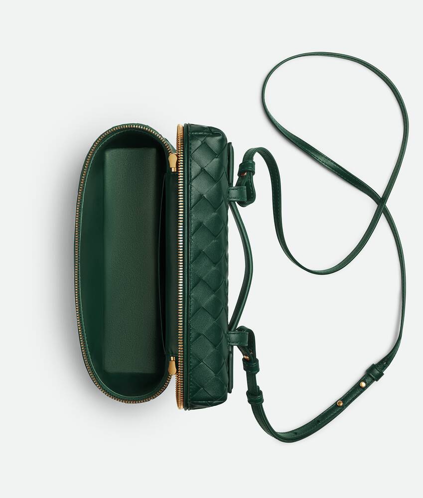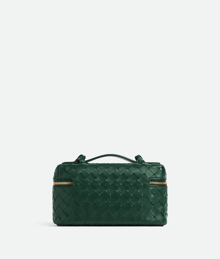 • Intrecciato leather vanity case with detachable strap • One main compartment, one flat pocket • Zippered closure • Material: Calfskin • Lining: Calfskin • Color: Emerald Green • Hardware: Gold finish • Height: 13 cm | 5.1” • Width: 23 cm | 9” • Depth: 6 cm | 2.4” • Handle drop: 4.5 cm | 1.8” • Strap drop: 45 cm | 17.7”