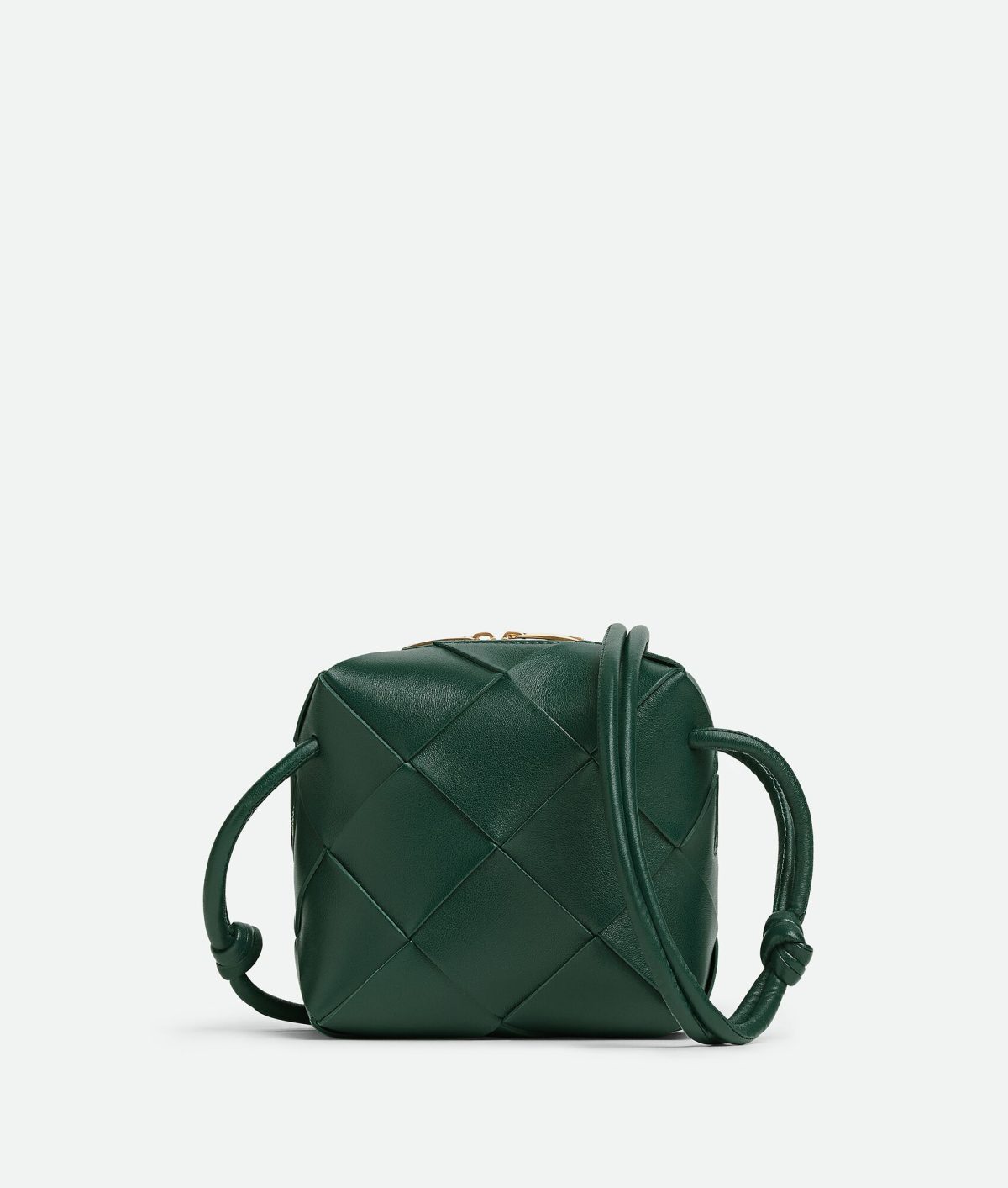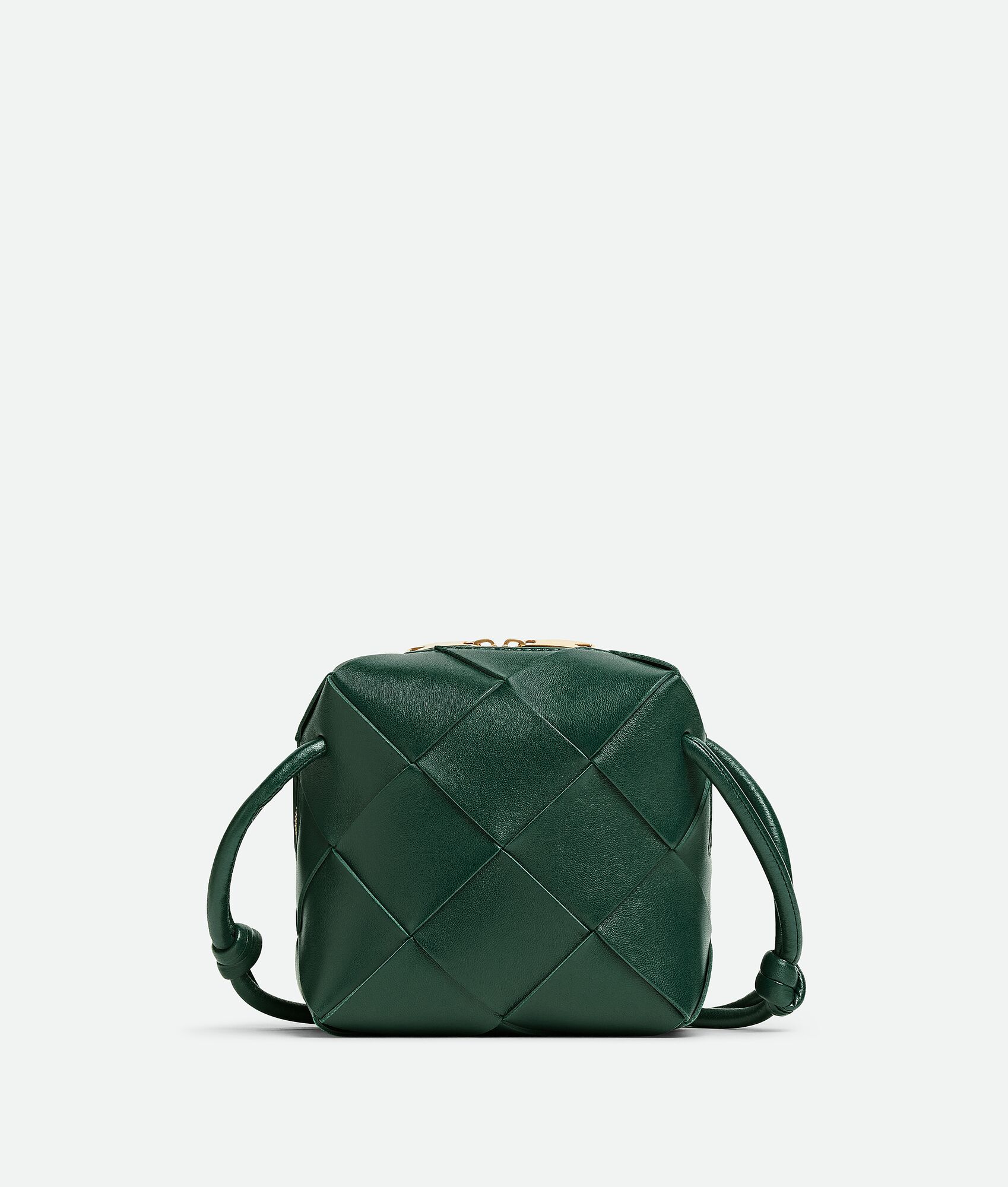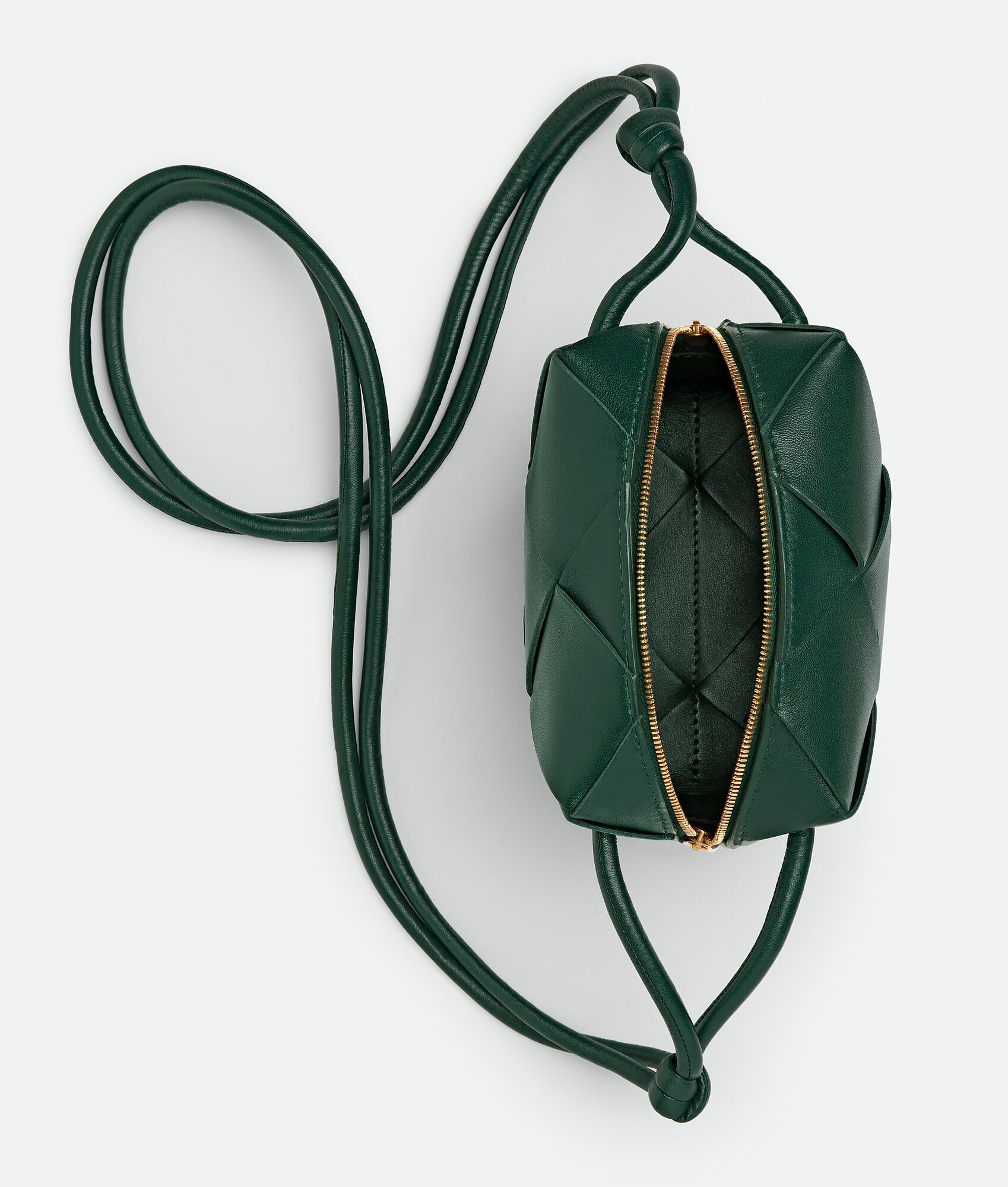 • Lining: Calfskin bonded Intreccio • Color: Emerald Green • Hardware: Gold finish • Height: 14.5 cm | 5.7" • Width: 14.5 cm | 5.7" • Depth: 7.5 cm | 3" • Strap drop: 55 cm | 21.7"