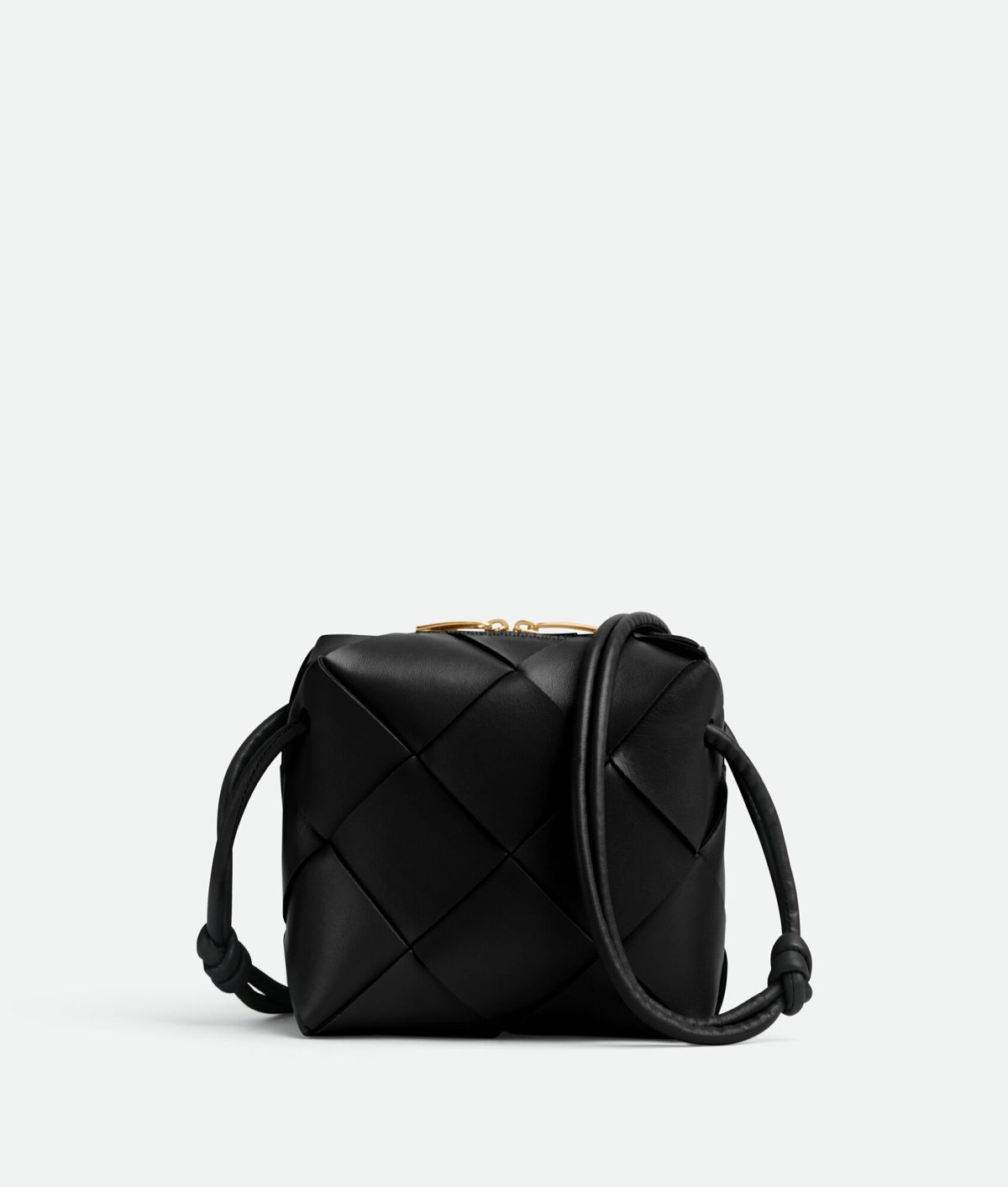 • Lining: Calfskin bonded Intreccio • Color: Black • Hardware: Gold finish • Height: 14.5 cm | 5.7" • Width: 14.5 cm | 5.7" • Depth: 7.5 cm | 3" • Strap drop: 55 cm | 21.7"