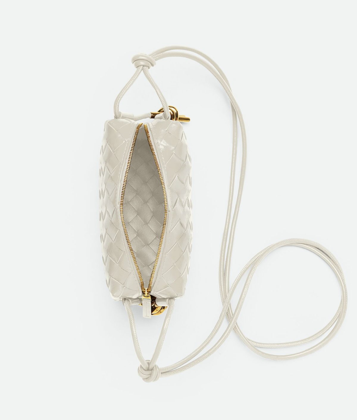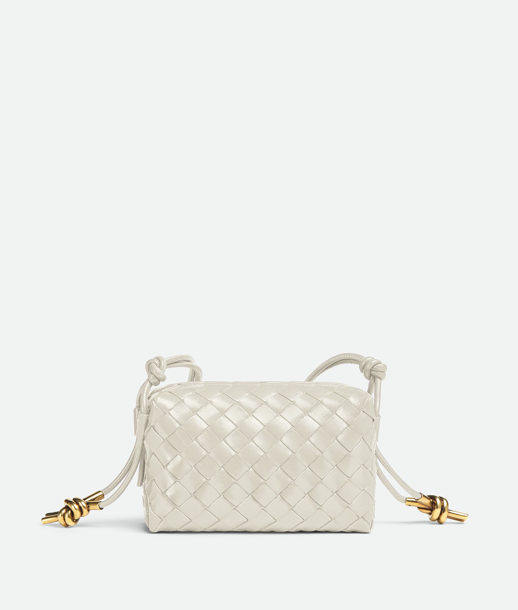 •Mini intrecciato leather crossbody bag with knotted metallic embellishment • Single compartment • Zip closure