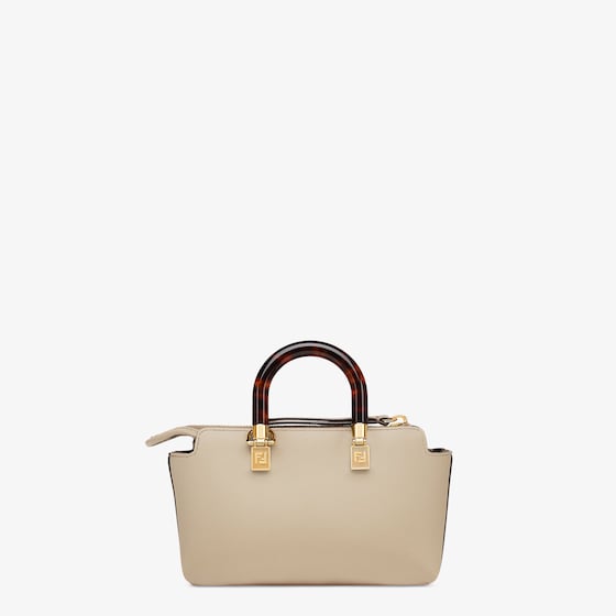 Iconic mini By The Way Boston bag made of dove gray leather with hot-stamped FENDI ROMA lettering and rigid tortoiseshell-effect plexiglass handles. Zip fastening. Featuring a fabric-lined interior with a pocket and gold-finish metalware. The bag can be carried by hand with the handles, or worn either on the shoulder or cross-body with the detachable shoulder strap.