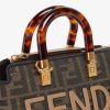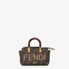 Iconic mini By The Way Boston bag, made of an FF motif jacquard fabric in brown with FENDI ROMA lettering in beige leather. Stiff tortoiseshell-effect plexiglass handles. Zip fastening. Featuring a lined interior with a pocket and gold-finish metalware. The bag can be carried by hand with the handles, or worn either on the shoulder or cross-body with the adjustable, detachable shoulder strap.