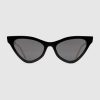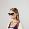 Influenced by the coveted styles of the ’50s and ’60s, the cat eye glasses have a shaped frame with an upsweep at the outer edges in black acetate that continues to the temples, ending in gold metal tips. Each side is enriched with a Web effect detail in pearlized pink and tortoiseshell acetate, topped with an Interlocking G detail.