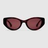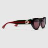 The Cruise 2025 eyewear collection blends a sleek silhouette and signature motifs in a contemporary design. These cat-eye sunglasses feature a Interlocking G detail on the green and red temples.