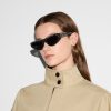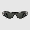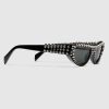 These striking cat-eye sunglasses feature a sleek shiny black acetate frame adorned with an array of eye-catching studs. Finished with solid grey lenses, they embody a bold yet sophisticated aesthetic that elevates any ensemble.