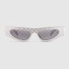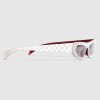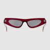 The eyewear collection puts a twist on the iconic Gucci signature silhouettes. These cat-eye sunglasses feature shiny silver-toned metal temples with allover GG motif, and Gucci Rosso Ancora red enamel on the inner temple and frame. A subtle Gucci logo draws inspirations from the House motif.