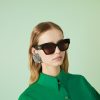 For the Pre-Fall 2023, cat-eye frames add charm to a selection of sunglasses. The signature Double G detail decorates the temples, completing the tortoiseshell acetate frame with brown lens.