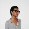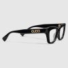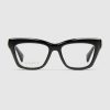 The Cruise 2025 collection comprises optical frames with signature motifs. This cat-eye frame features a logo and crystals on the temples.