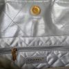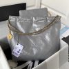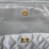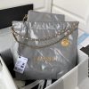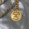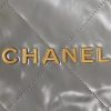 This small 22 Hobo bag is made of grey calfskin with gold-tone hardware and features the signature diamond quilting, gold-tone metal CHANEL lettering on the front, a removable pouch and a long gold-tone and black leather chain.