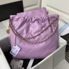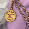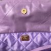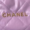 This small 22 Hobo bag is made of purple calfskin with gold-tone hardware and features the signature diamond quilting, gold-tone metal CHANEL lettering on the front, a removable pouch and a long gold-tone and pink leather chain.