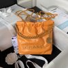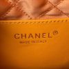 This mini 22 Hobo bag is made of orange calfskin with gold-tone hardware and features signature diamond quilting, gold-tone metal CHANEL lettering on the front, and a long chain interwoven with gold and orange leather.