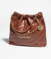 The 22 Hobo is crafted from brown calfskin leather with gold-tone hardware, featuring signature diamond quilting, gold-tone metal on the front, and a long chain interwoven with gold and brown leather.